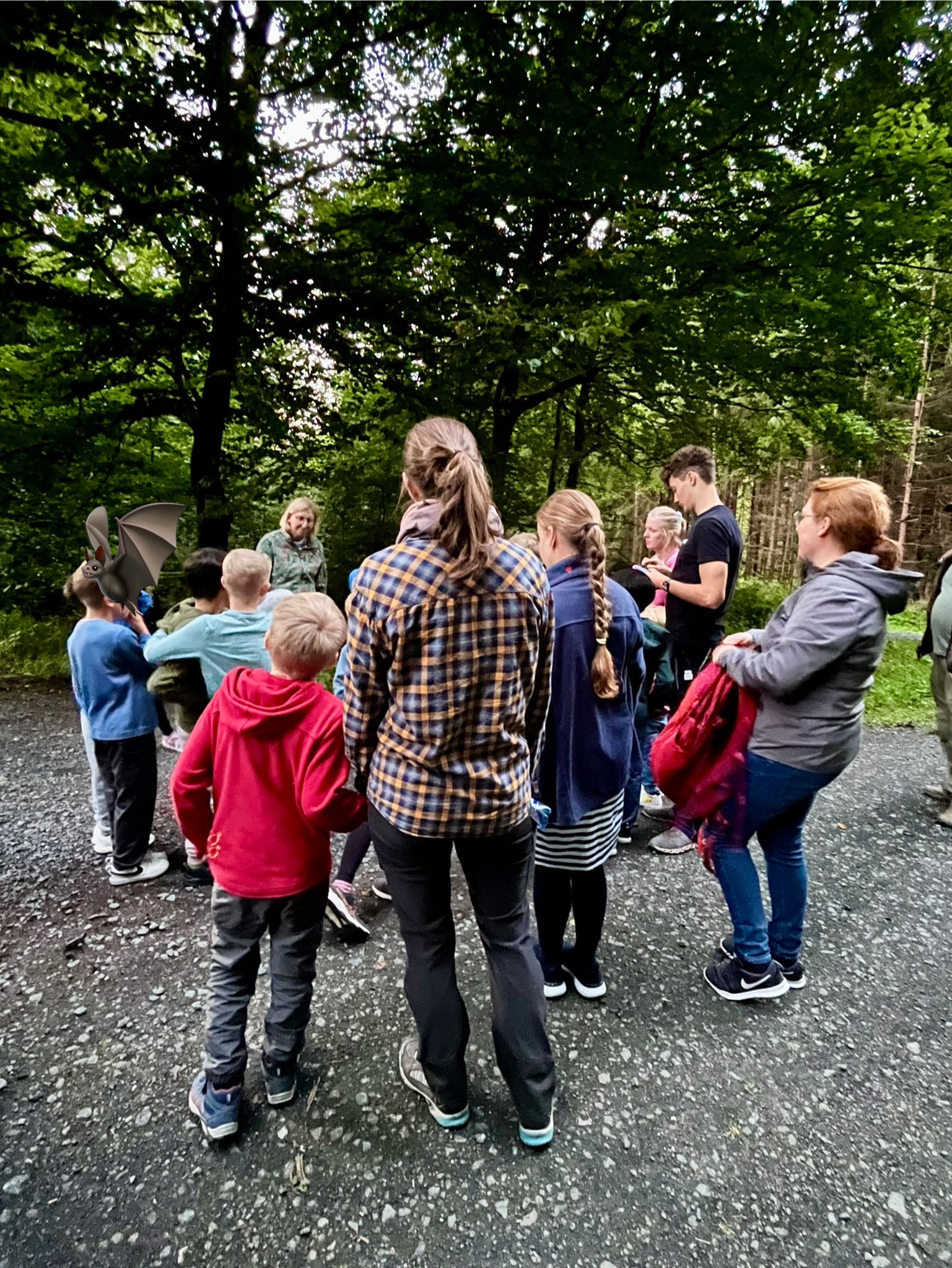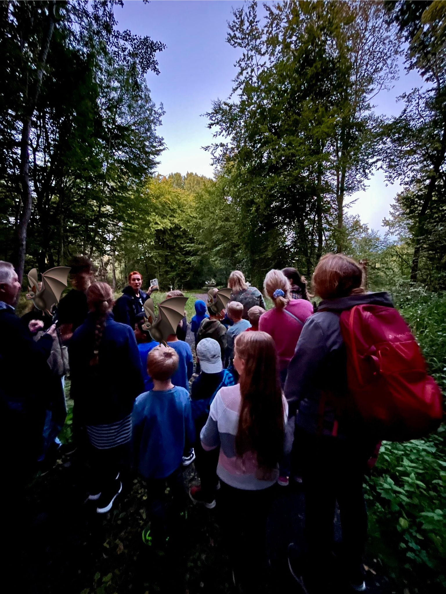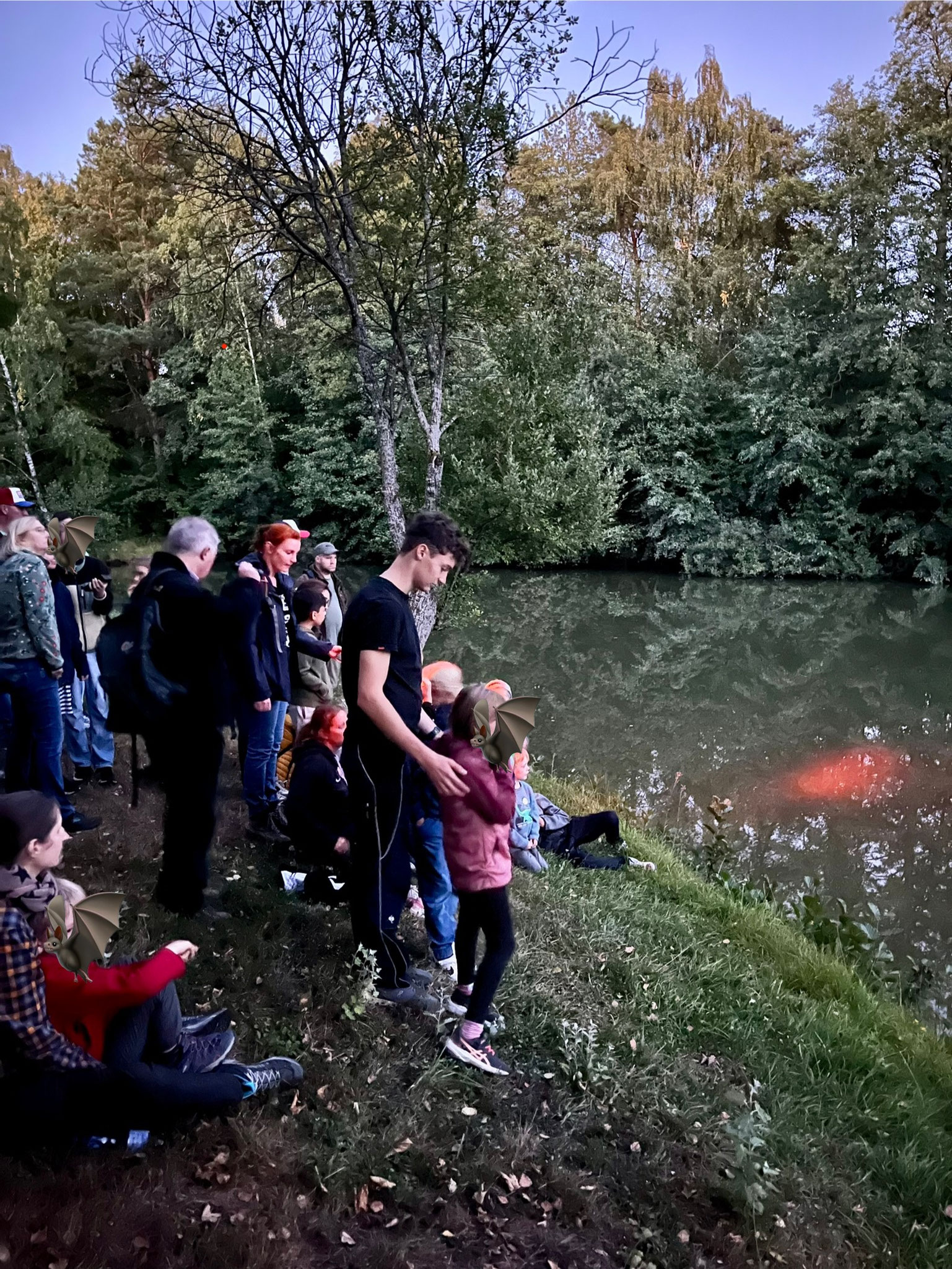 Zunächst haben wir mit ihnen interessante Fakten rund um die Kobolde der Nacht geteilt und uns mit Fledermausspielen aufgewärmt. Dann ging es, ausgerüstet mit Fledermausdetektoren, durch den Wald zu den Tongruben wo wir Fledermäuse bei deren Jagd nach Insekten über der Wasseroberfläche beobachten konnten.